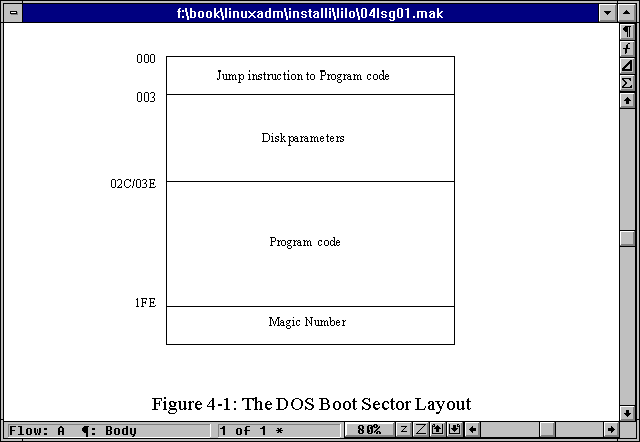 To understand the Linux boot process, a look at the DOS boot sector is necessary. Figure 4.1 shows the DOS boot sector layout. The program code is the bootstrap to the operating system. The disk parameters include the File Allocation Table (FAT).