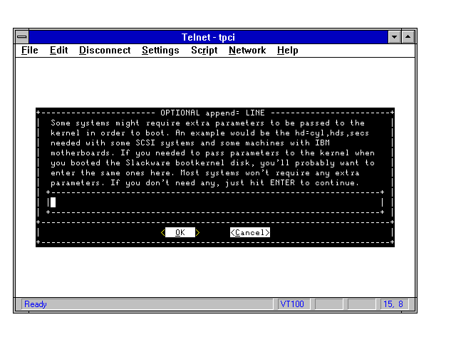 From the menu-driven system shown in Figure 4.3, select the Begin option. Usually, the first thing the program asks for is any boot-time instructions that need to be specified when Linux starts, as shown in Figure 4.4. Normally, there are no boot-time instructions, but if you had to enter any parameters to start the Linux installation process, specify the same options here.