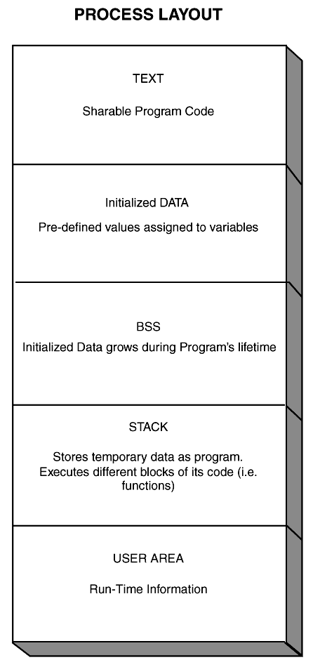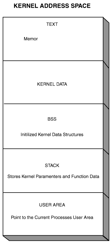 The user address space consists of five separate areas: Text, Data, Bss, stack, and user area.