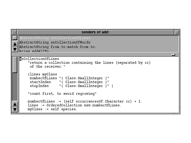 browsers for browsing through the Smalltalk class hierarchy, and a very powerful debugging utility. The unique aspect of Smalltalk/X is that it can also behave as a Smalltalk-to-C translation utility. This is a very useful feature because this means that
