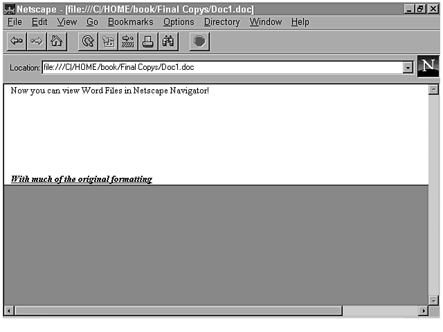Inso Corporation (http://www.inso.com/) has developed a Microsoft Word 6.0 (and 7.0) document viewer. The uses of this plug-in should be quite obvious in that you need not even save the file in a different format to allow others to view your Word files. All files from 6.0 and earlier are now available for publishing via the web. Figure 10.8 shows a small example of a word format file.