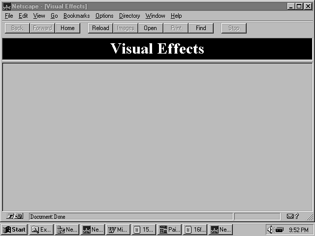 Because Netscape 2.0 does not provide a way to update a document directly once it has been written to the screen, all of the effects we create here require that we write a new document to the screen for each step in an animation, marquee, or other effect. Rather than load each successive document from the server (which would be much too slow), we'll generate our documents on-the-fly and then slap them into frames. Listing 15.1 shows the skeleton frameset that we'll develop in the examples that follow.