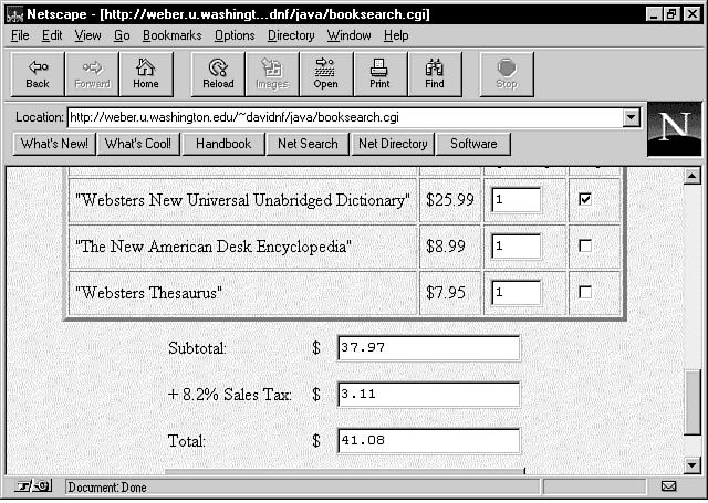 "The page is pretty standardized," Nagy-Farkas says. "The user submits a choice for book categories, and the CGI script returns with a brand new page." With the JavaScript functions in place, it becomes a matter of getting the right information into the document.