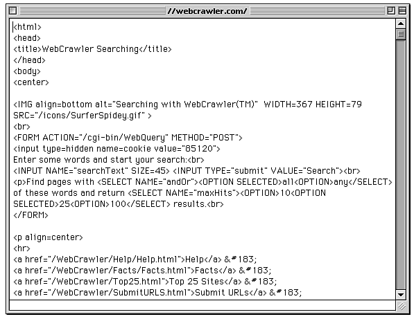 This is the WebCrawler page, a Web search engine offered by America Online. Your next step is to view the source of this document. Select the View Document Source command in your Web browser's Edit menu. What you see will look something like figure 13.1.