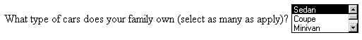 <SELECT> types allow you to control how users respond by offering them access to menu listings. Menus can be either pop-up or scrolling, giving the user the ability to make a single choice or multiple choices from each menu.