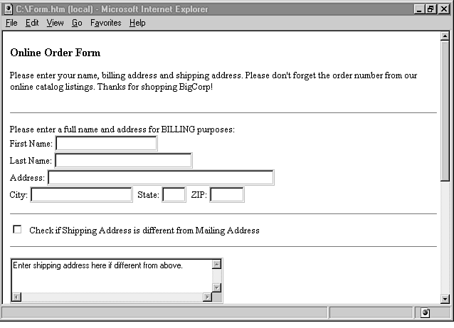 Here you've taken advantage of most of the options available to you for forms (see fig. 13.12). Notice that, if the checkbox for Check if Shipping Address is different from Mailing Address is left unchecked, you can assume (in the processing script) that the textarea can be ignored. Also notice how using the MAXLENGTH attribute for State: and ZIP: allows you some very basic error checking in these fields. At least, you know that users are entering the correct number of characters.