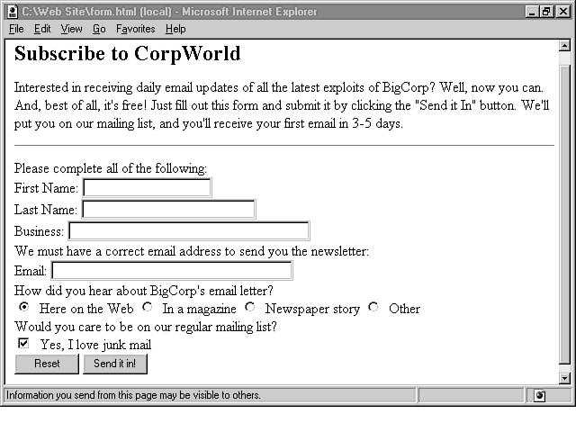 Along with all the other <INPUT> types, now you've finally got a way to submit data. So, let's create a more involved form that includes some of these examples-a subscription form.