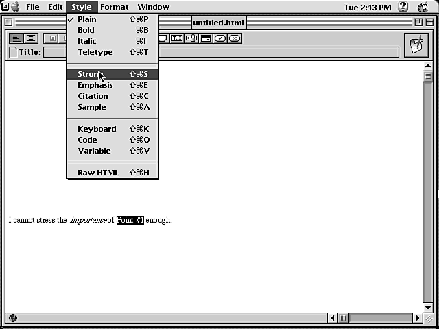 In plain text, I can go back with the mouse and highlight importance then use either +I or the menu command Style, Italics to change the text to italic. Selecting Point #1, I could use Shift++S or Style, Strong to apply the HTML tag <STRONG> to that text (see fig. 29.1).