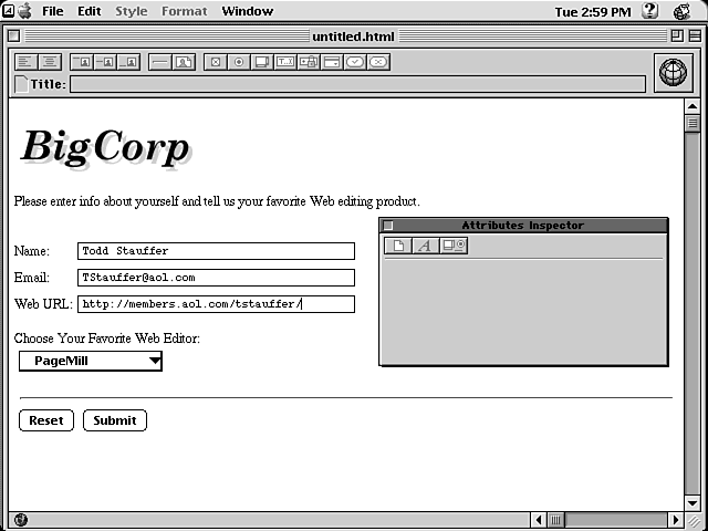 PageMill makes form creation so easy that we might as well cover it here. There are basically two steps to creating your form. You start by using the button bar to create and paint the entry elements onto your screen. Next, you pull up the Attributes Inspector again and use it to assign names, sizes, and forms submitting information.