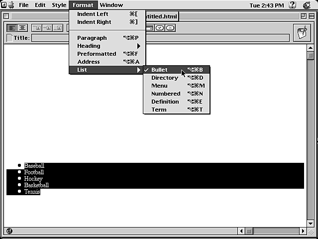 Now, by highlighting the list and choosing a list style from the Format, List menu, we can quickly turn this regular text into an HTML list (see fig. 29.2).