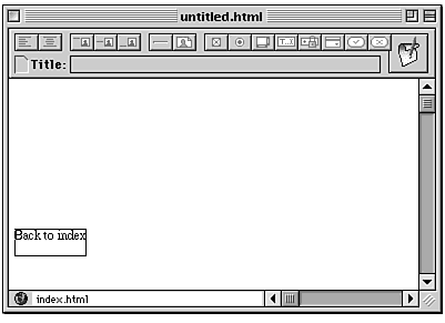 Another way to add links to your pages is by using drag-and-drop. Within PageMill, you can link to another page (if it's currently open in its own PageMill window) by dragging the small Page icon (next to the "title" text box at the top left of the PageMill window) to the document that you're currently editing. The link automatically appears with the title of the page as its text.