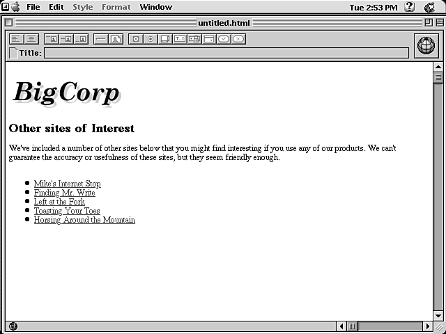In my personal opinion, PageMill is the best example of an application that really makes powerful HTML easier than hand editing. Unfortunately, even PageMill doesn't offer every HTML tag and construct we've learned in this book. But it's a good start, and you can always go back in with a text editor to change things.