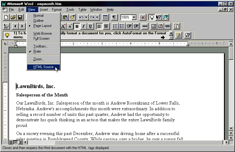 - Word will automatically convert your document to HTML, adding