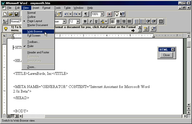 - If you switch back to HTML Edit mode from the View menu, you