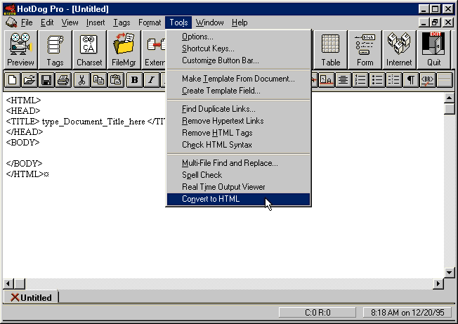 - Launch HotDog Professional and choose Convert to HTML from