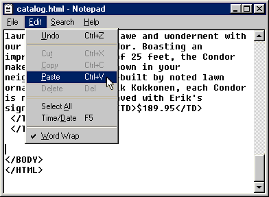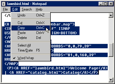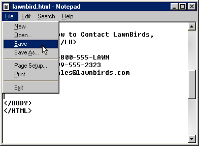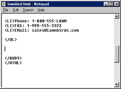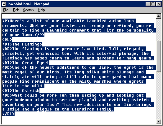- Launch Notepad and open the lawnbirds.html file that you saved