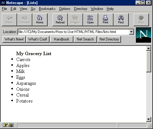 The simplest list in HTML is the unordered, or bulleted, list.