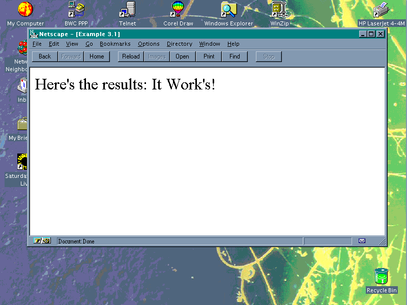 document.writeln("It works!<BR>");