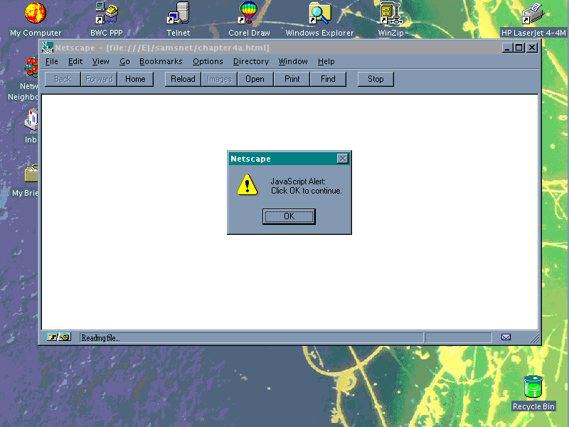 Next, take the preceding example, Listing 2.4, the "Welcome to Netscape Navigator 2.0!" example, and have the message displayed in an alert box.