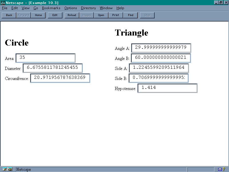 Hypotenuse: <INPUT TYPE="text" NAME="hypotenuse" VALUE=1.414 onChange="hyp(this.form);">