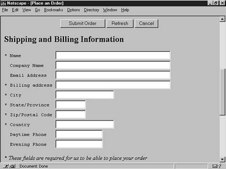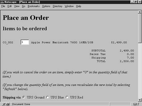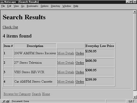 One of the major strengths of the CGI approach over static HTML is, of course, the ability to dynamically generate the contents of a page. The best approach to setting up a list of products for sale is to define a database that contains the product information such as the price, whether it's in stock, and a brief description of the item. Because this information is dynamic, you want the ability to generate your pages based on the current state of your products. If something is out of stock, you would like to be able to tell the shoppers and provide them with an estimated date of when it may be available again.