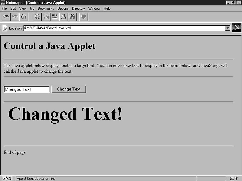 <HTML> <HEAD> <TITLE>Control a Java Applet</TITLE> </HEAD> <BODY> <H1>Control a Java Applet</H1> <HR> The Java applet below displays text in a large font. You can enter new text to display in the form below, and JavaScript will call the Java applet to change the text. <HR> <FORM NAME="form1"> <INPUT TYPE="TEXT" NAME="text1"> <INPUT TYPE="BUTTON" VALUE="Change Text" onClick="document.ControlJava.SetMessage(document.form1.text1.value);"> </FORM> <HR> <APPLET NAME="ControlJava" CODE="ControlJava.class" WIDTH=450 HEIGHT=125> </APPLET> <HR> End of page. </BODY> </HTML>
