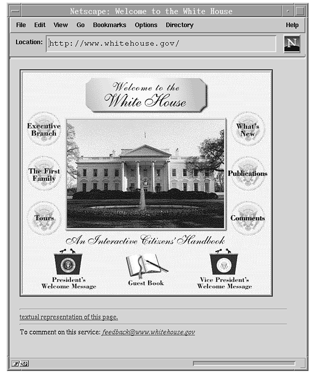 With the wider use of inline images and imagemaps (see Chapter 16) in graphical browsers, a more modern form of page design has emerged. Marked by a use of graphics to draw attention, reveal choices, and provide ornament, this style of web-page design runs the gamut of expressions, ranging from the single-graphic slab of the United States White House's web in its initial design in 1995 (see Fig. 11.10, http://www.whitehouse.gov/) to a mixture of graphics and text often arranged in a grid to reveal functionality.