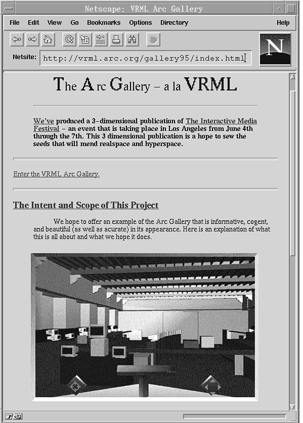 The next advance in web style involves VRML (see Chapter 28, "Virtual Reality Modeling Language"). VRML, now in its 2.0 specification, already has altered the conception of the Web as predominantly text (although with many graphics, as described previously). With VRML, on-line information can be viewed as an environment in which the room or the scene becomes a unit of attention for the user. Figure 11.12 shows an example of a virtual scene on a web page.