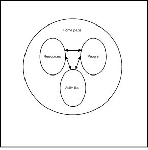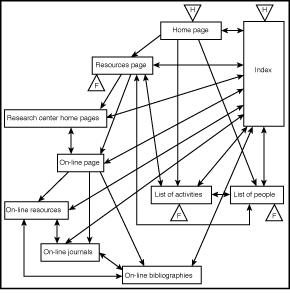 At the web level, a designer can determine the relationships among the packages of information. Packages consist of web pages that are related according to some organizational scheme. A package of pages, for example, is the collection of the pages linked from the Resources page in Figure 11.14: the pages labeled "Research center home pages," "On-line page," "On-line journals," and "On-line bibliographies." Similarly, the implementation of the list of people and activities can be abstracted to be packages of information that can be implemented in a single page or a series of pages. The result is a representation of Figure 11.14 at a higher level of granularity, as shown in Figure 11.15.
