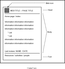 Based on the page and link diagram shown in Figure 11.14, a look-and-feel diagram can be designed for the web. Figure 11.17 shows this diagram, which includes links for the footer information, header information, and the web icon. Chapter 12, "Basic HTML 3.2," discusses how this simple look-and-feel diagram can be used as a template for web implementation.
