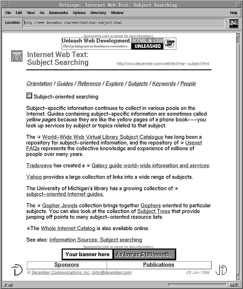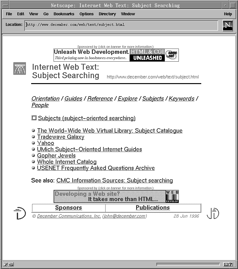 Another alternative is to provide different views of the same information. Figure 11.4 shows a linear, list-oriented view of a set of information; Figure 11.5 is a different view of the same link information presented in a more expanded, narrative form. First-time users of the information might benefit from the expanded form, whereas frequent or expert users could use the list view. In this particular instance, the connection from one view to the next is made accessible to the user; the phrase Subjects (subject-oriented searching) is a hotspot leading to the page shown in Figure 11.5. The square icon to the left of the phrase Subject-oriented Searching in Figure 11.5 is a hotspot connecting the user to Figure 11.4.