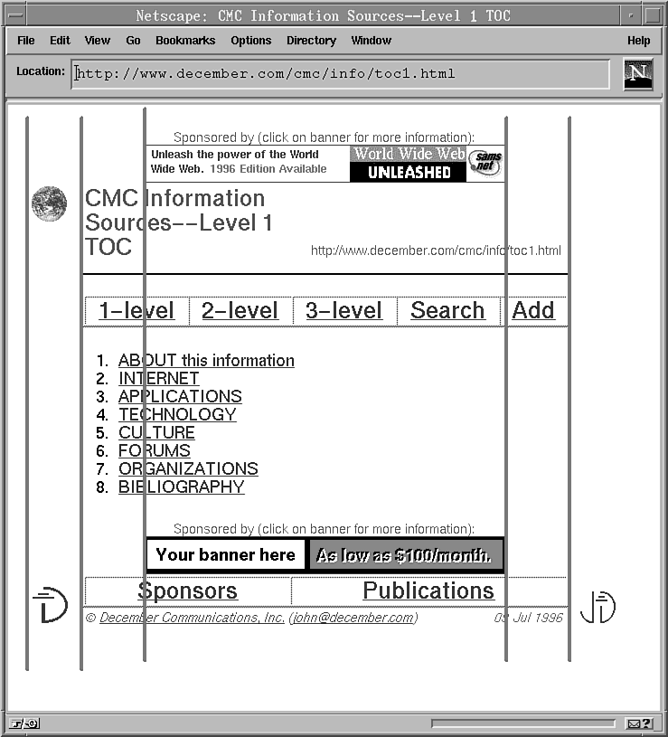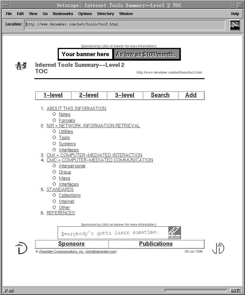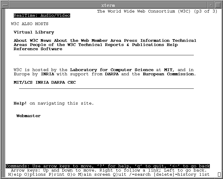 The earliest examples of web page design were in the text-only browsers-in particular, the CERN (the Swiss Laboratory for High Energy Physics research) browser associated with the origin of the Web. Influenced perhaps by the hierarchical organization common in previous information systems such as Gopher, FTP, and Telnet, the early ASCII design style relies heavily on the hierarchical organization and links to extend meaning. Figure 11.9 shows a typical organization of a web page designed as part of the WWW Virtual Library and viewed through a Telnet session.