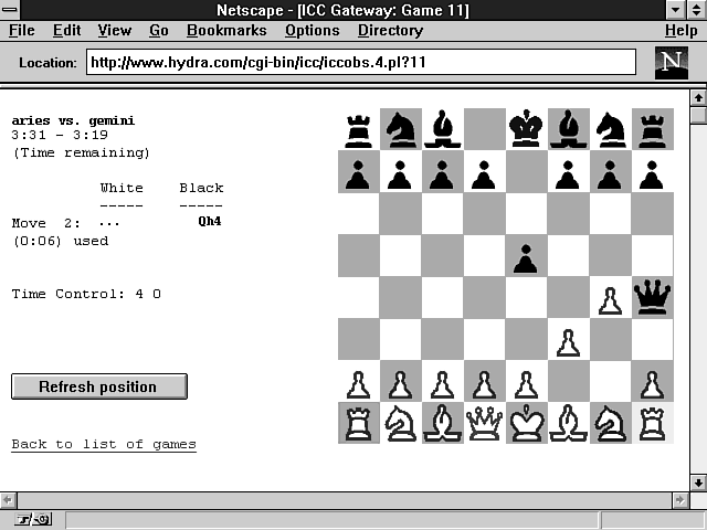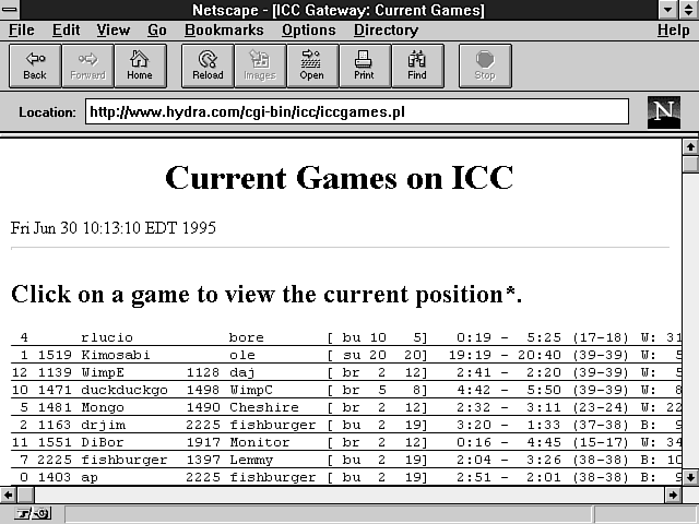The Internet Chess Club can be reached via telnet://chess.lm.com 5000 or via e-mail at icc@chess.lm.com. Users behind firewalls beware: Your access to this nonstandard port may be blocked.
