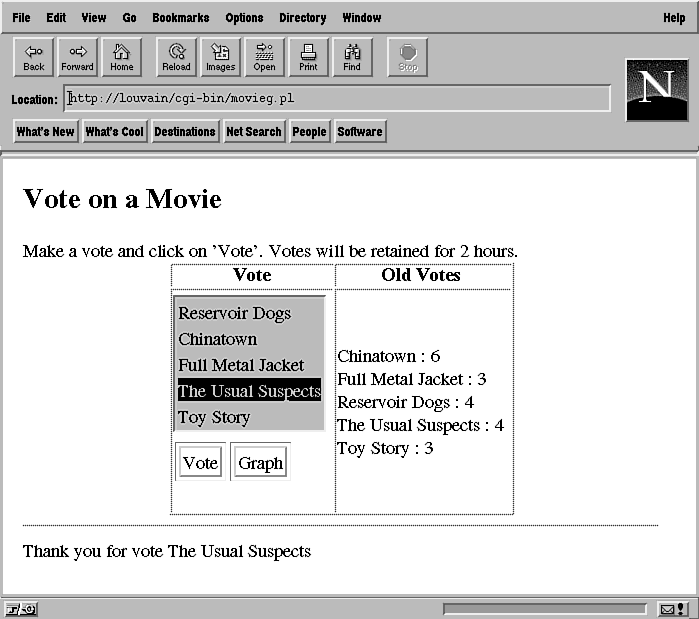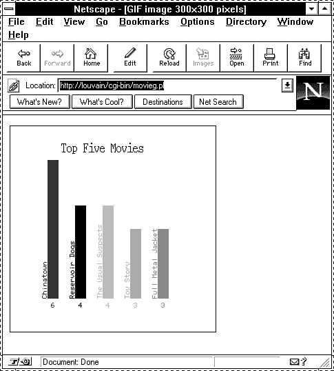 Examples of several graphics packages are given, including gnuplot, a charting program; netpbm, a collection of image-manipulation programs; and gd1.1.1, a C library written by Thomas Boutell. Each of these packages can accept input via the command line or stdin, and they work well in the CGI environment. And, in a grand finale of this section, I present an application that uses both CGI.pm and GD.pm Perl 5 modules to allow a user to vote on movies, have those votes preserved across sessions, and request a dynamically generated graph of the top five movies.