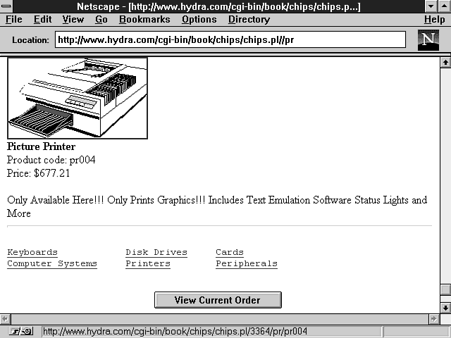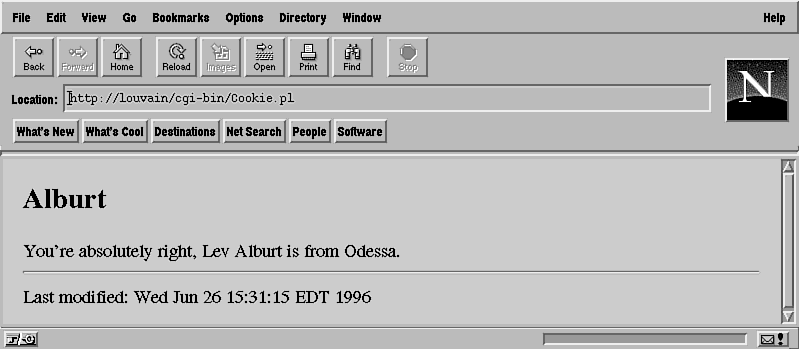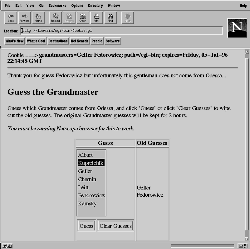 I also present an example using Lincoln Stein's Perl 5 CGI.pm module with Netscape Cookies to show Netscape's vision of simplified state maintenance.