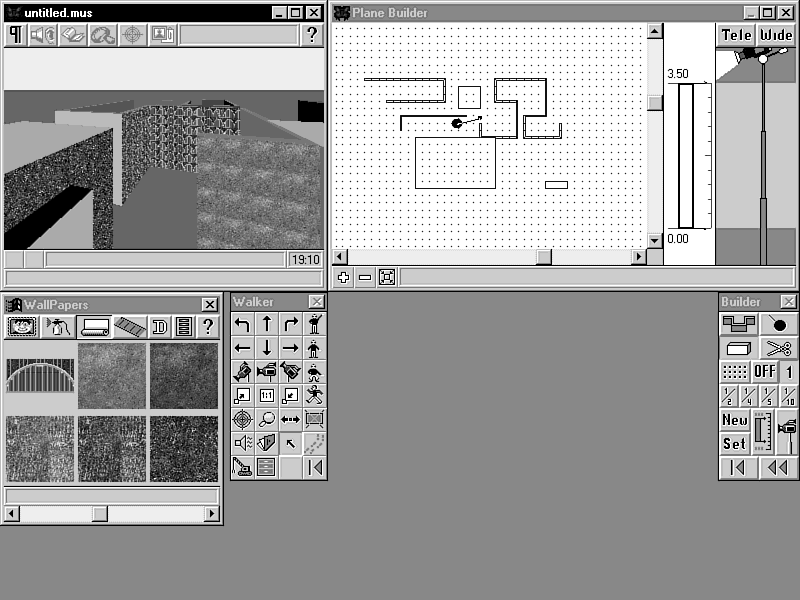 VHSB has a very cool user interface, including a first-person view window, a 2-D architectural overview, tool panels, and a camera panel that lets you visually set the properties of the camera looking at the first-person view window. There is also a pictures window that lets you select pictures, movies, and textures to wallpaper on surfaces.