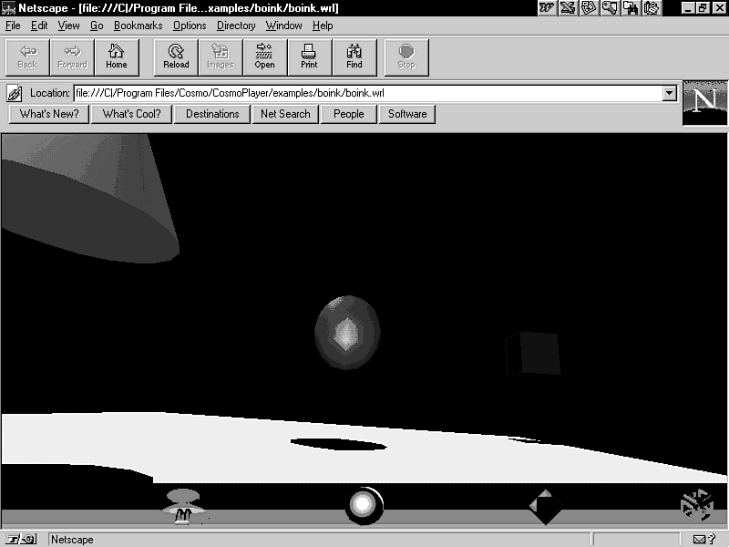 Cosmo Player is Silicon Graphics's new VRML 2.0 browser (see Fig. 28.3). Amazingly, Cosmo Player was available for Windows PCs even before it became available on Silicon Graphics machines. Cosmo Player includes support for a significant portion of the VRML 2.0 specification. It uses a variant of JavaScript called VRMLScript to define behaviors and interactions between VRML 2.0 elements. It also includes a built-in VRML-1.0-to-2.0 converter so that 1.0 worlds can be viewed.