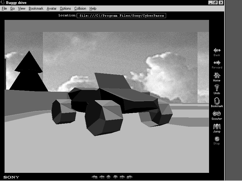 When you move the mouse over objects that have actions, the mouse icon changes to a hand. CyberPassage comes with several exciting demos, including a dune buggy that drives around a course. You click the dune buggy to get it started and then click it again to stop it. The demos can be hard to find on your computer. Windows 95 users can look in the C:/Program Files/Sony/CyberPassage/contents/ directory.