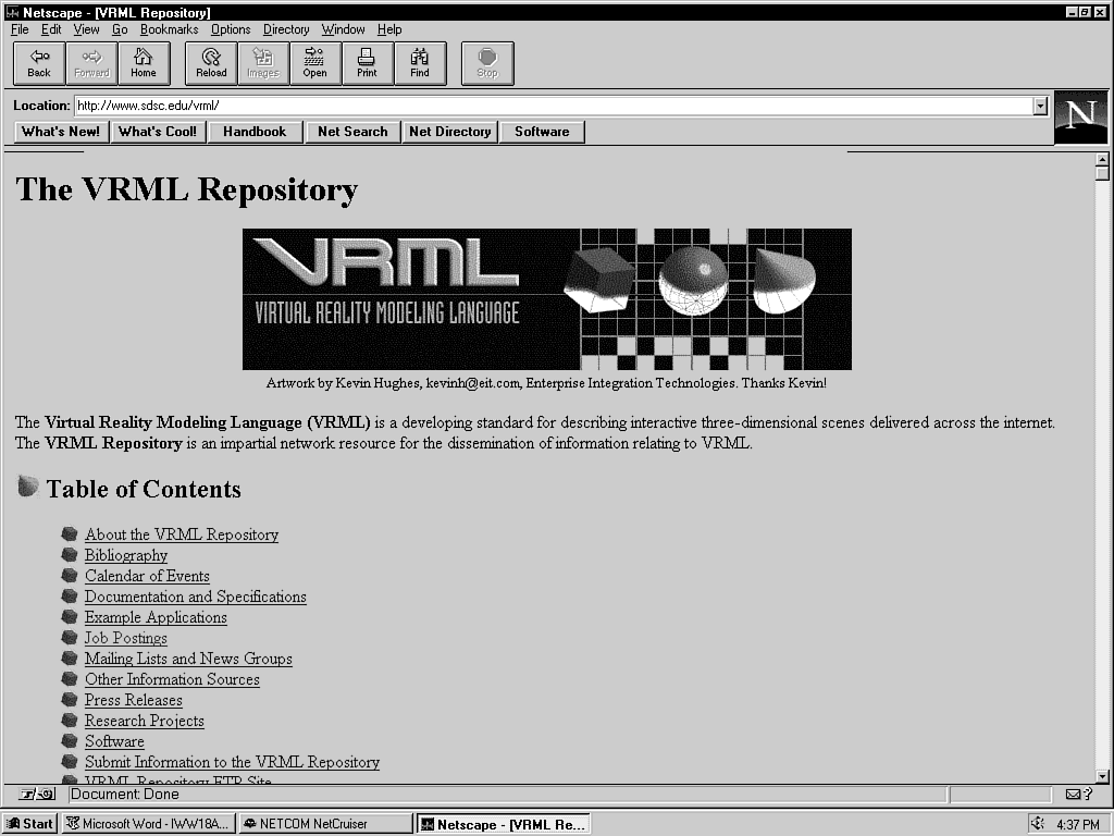 The VRML Repository (http://www.sdsc.edu/vrml) contains links and information on a variety of VRML information, including VRML browsers, converters, and examples (see Fig. 28.6). It was the first significant place for information on VRML.