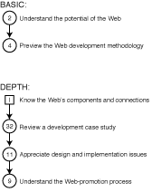 Orientation or executive overview For people who just want to get a quick idea of the what the Web can provide and the basics of how information can be developed for the Web, Figure I.1 shows a possible track through this book. Chapter 2 presents the potential of what the Web can do, and Chapter 4 provides an overview of Web content development issues. For more in-depth coverage for an executive audience, the other chapters of Part I round out the coverage of the Web's components; and Chapters 32, 11, and 9 provide good overviews of a case study, design and implementation, and web promotion and business models. This is also a useful path for users of web information who might not be involved in information development in detail.