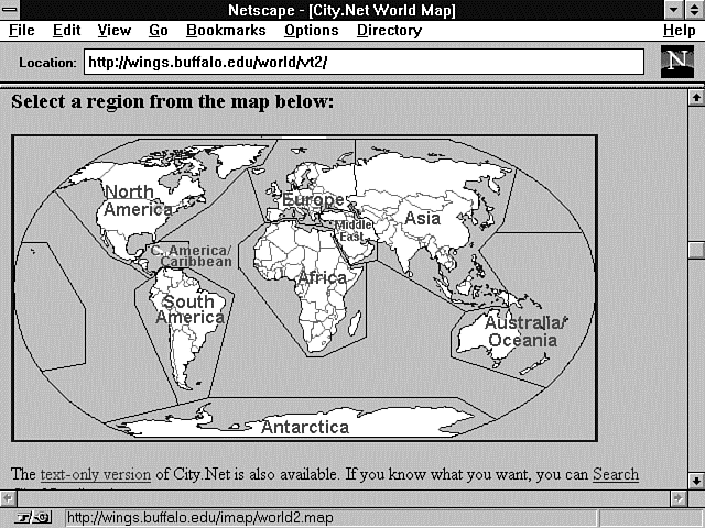 It is a server error to not have a default defined and have a mouse click that is not within a valid region. When you click the world out in the middle of the ocean, you are sent to a text version of the city.net Web site. I'm not sure whether the developers are punishing me for clicking their map in an unmarked region or whether they figure that if I can't select a valid region with a mouse, I'm too stupid to use their map and I should be using text anyway. Actually, I'm sure that it is just a logical decision on their part to move me to an area better suited to my talents. All kidding aside, links created by hypertext references always are faster, so moving the errant mouse clicker to a text input site is very reasonable.