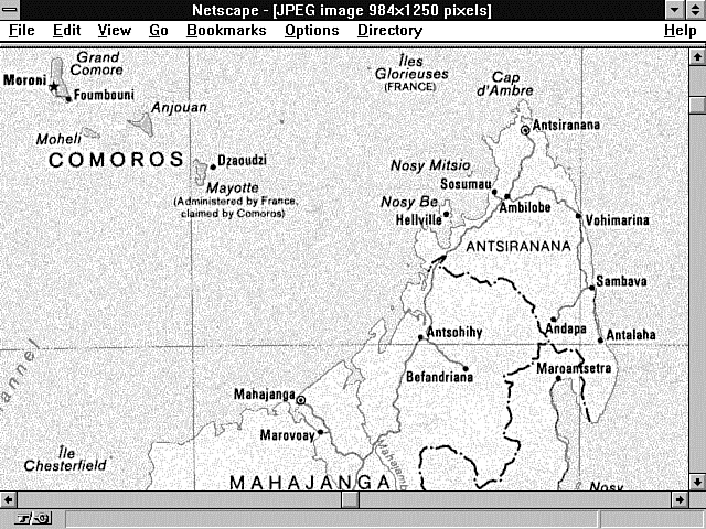 Nothing prevents this image from being a mapfile except the HTML that defines the link to the map of Madagascar. The image of Madagascar is too big to fit onto a single screen, as shown in Figure 9.3, but imagemaps use the size of the image as a definition of the x,y coordinates sent to your imagemap program, not the size of the screen displaying the image. The Madagascar image is approximately 985¥1,250 pixels, as measured from the upper left corner to the lower right corner. Having a map that is bigger than the computer screen can make your Web clients uncomfortable, because they can't see all the information they need to make a decision on one screen. That's usually considered bad Human Factors design. But if you try to squish down the map of Madagascar into one screen, you either have to distort the image or you can't distinguish anything. So in this case, a large image is probably a good choice. Also remember that you might not be using images on your site. If that's the case, as it is here, you don't have any control over the image size.