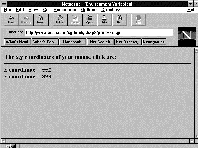 Listing 9.1 shows a short program that reads and prints the x and y coordinates passed after the imagemap is clicked. Figure 9.4 shows the output from Listing 9.1.