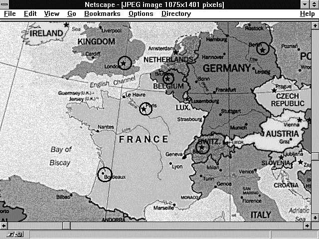 01: default http://www.accn.com/cgi-bin/return-same-location.cgi 02: #Ireland 03: circle http:/www.city.net/countries/ireland/dublin 219,703 223,691 04: #Switzerland 05: circle http:/www.city.net/countries/switzerland/bern 493,948 501,936 06: poly bern 209,623 227,631 193,653 197,667 211,661 227,676 225,719 209,736 135,749 103,683 209,622 07: #United Kingdom 08: circle http:/www.city.net/countries/united_kingdom/london 336,781 352,777 09: #Belgium 10: circle http:/www.city.net/countries/belgium/brussels 423,812 425,823 11: #France 12: circle http:/www.city.net/countries/france/paris 378,872 362,874 13: #France 14: circle http:/www.city.net/countries/france/bordeaux 296,1006 303,1022 15: #Germany 16: circle http:/www.city.net/countries/germany/berlin 613,750 613,765 17: #United Kingdom - This image overlaps with the city of 18: #London. The circles that define the hotspots 19: #for all cities in the United Kingdom must come before the polygon 20: #that defines London 21: poly http:/www.city.net/countries/united_kingdom 195,655 214,659 230,672 234,705 175,825 361,807 393,739 360,444 189,544 229,627 213,657 22: #Belgium - This image overlaps with the city of 23: #Brussels. The circles that define the hotspots 24: #for all cities in Belgium must come before the polygon 25: #that defines Brussels. 26: poly http:/www.city.net/countries/belgium 400,792 423,798 437,790 458,804 468,827 454,859 420,841 384,801 414,785 27: #France - This image overlaps with the cities Paris and 28: #Bordeaux. The circles that define the hotspots 29: #for all cities in France must come before the polygon 30: #that defines France 31: poly http:/www.city.net/countries/france 386,801 392,815 420,841 445,857 471,871 505,879 487,923, 478,925 453,961 471,983 465,1007 32: 483,1051 464,1074 376,1093 253,1048 265,923 216,876 221,860 289,834 385,800 #Switzerland - This image overlaps with the city of 33: #Bern. The circles that define the hotspots 34: #for all cities in Switzerland must come before the polygon 35: #that defines Bern 36: poly http:/www.city.net/countries/switzerland 479,927 513,918 535,929 535,939 554,947 556,961 548,969 522,981 497,981 474,981 455,961 37: #Germany - This image overlaps with the city of 38: #Berlin. The circles that define the hotspots 39: #for all cities in Germany must come before the polygon 40: #that defines Berlin 41: poly http:/www.city.net/countries/germany 481,726 515,680 607,683 626,709 650,805 591,833 630,880 604,902 615,924 531,924 487,918 Mapedit is a WYSIWYG (What You See Is What You Get) editor for imagemap files. Mapedit is available at http://www.boutell.com/mapedit/
